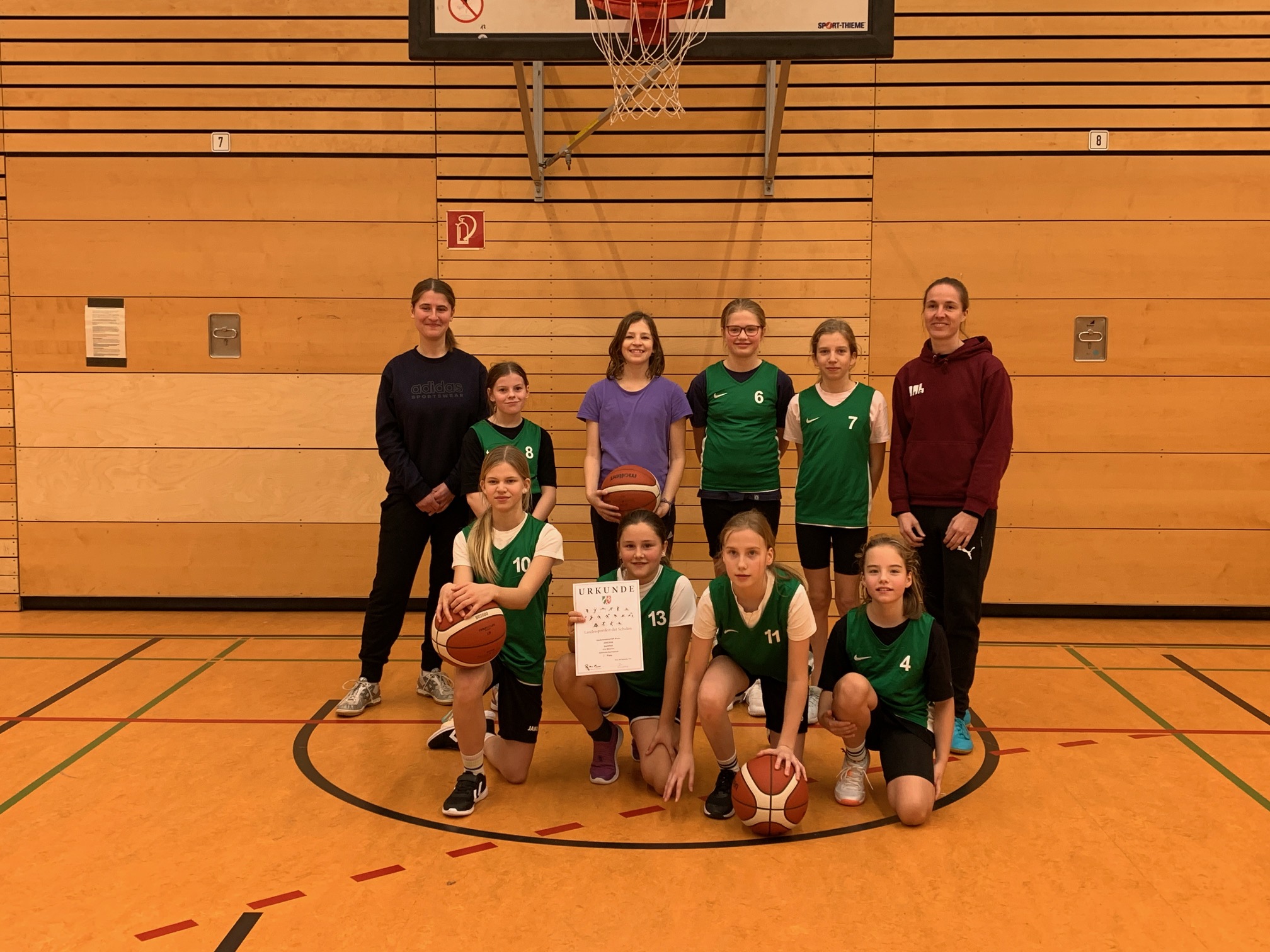 U14-Mädchen, 2. Platz:Tessa 5e, Amelie 6a, Finja 6a, Linda 6a, Judith 6c, Emma G. 6c, Emma S. 6 c, Lotta 7c, Mathilda 10b (Sporthelferin), Frau Marcks