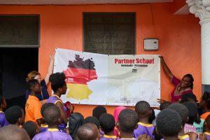 Am Tag vor unserer Abreise hatte Emelia dann noch eine kleine Überraschung für uns. Die drei Räume, die im Sommer 2024 dank großzügiger Spenden von uns gebaut werden konnten, haben Namen bekommen. Der Raum B9 heißt jetzt Helmholtz-Gymnasium: